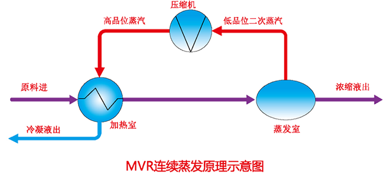 1、MVR蒸發器工作原理是將蒸發器原本需要用冷卻水冷凝的二次蒸汽,經壓縮機壓縮后提高其壓力和飽和溫度,增加焓值,再送入蒸發器加熱器作為熱源來加熱料液,由于重新利用它自身產生的二次蒸汽的能量,減少對外界能源需求,達到節能。